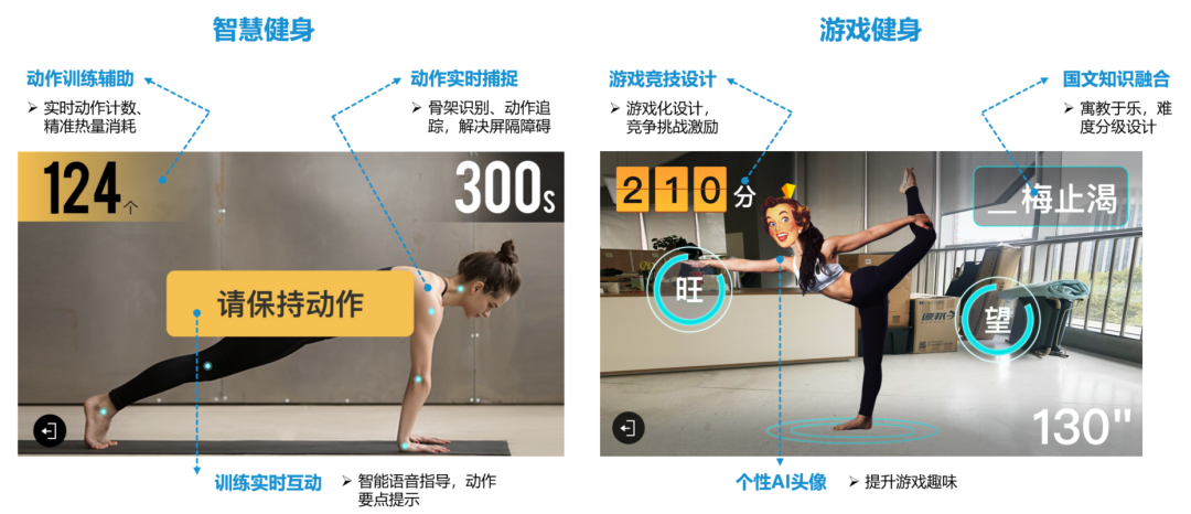 十四五规划强调要落实全民健身国家战略。面对当前疫情反复的现状,咪咕善跑推出智能互动健身功能,支持通过手机或大屏(带摄像头)点播健身课程,基于边缘AI实时监控用户运动数据,通过RTC技术和用户实时互动,并纠正错误动作,达成私人教练及健身馆效果。