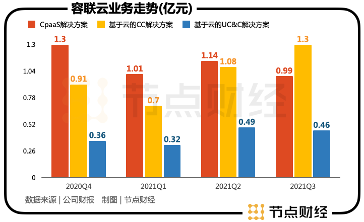 由于内部管理和监管原因,容联云最近的一份财报是去年的三季报。当时的情况是,CC业务已是增长最快的业务,同比增长125.4%。这似乎表明公司的新增长点已经培养成功了,但是,从公司整体的业绩走势看,事实并非如此。