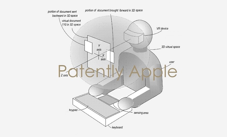 Gurman 补充说,“该设备还将具有生产力功能,包括作为 Mac 的外部显示器的能力。有了这个功能,用户将能够在虚拟现实中看到他们的 Mac 显示器,但仍然可以使用触控板或鼠标和物理键盘。” Apple 的一项专利还向我们展示了未来的耳机可以使用虚拟键盘并能够查看 3D 文档。下图来自该专利。