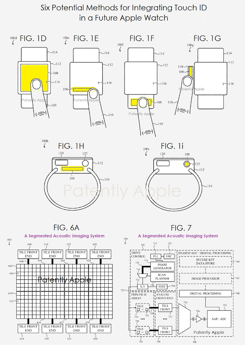 苹果的专利图1D-1i描述了Apple Watch在不同位置的Touch ID示例。