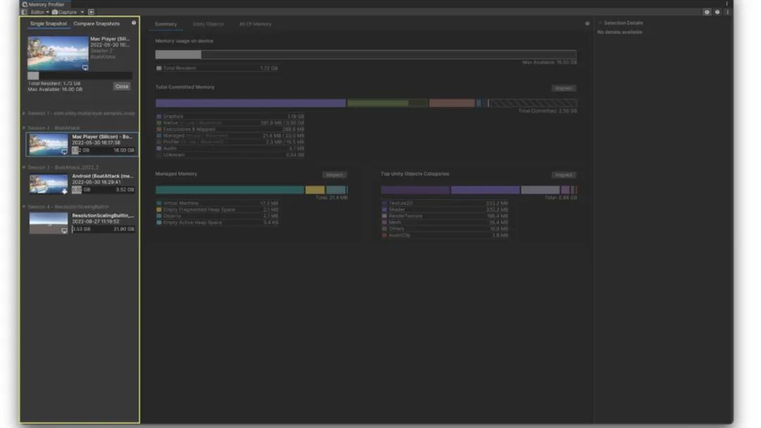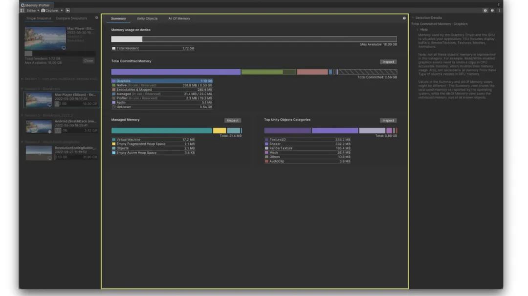最后,摘要(Summary)视图是开展详细分析,如“占内存最大的 Unity 对象”或“托管内存拆分”等的入口。