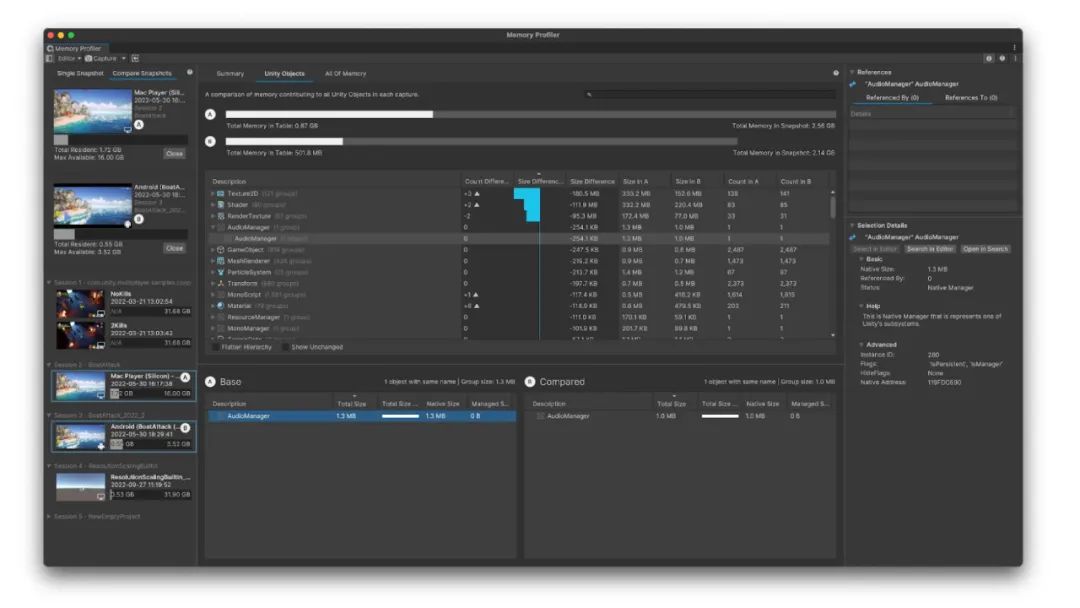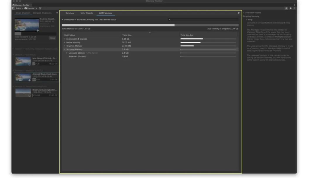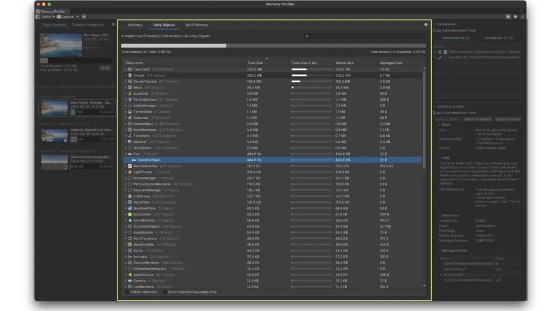 Memory Profiler 可以解决以上问题,让用户能够截取并审查游戏在特定时间点的内存占用情况。并借助这些“快照”,让用户找出游戏中最占内存的部分或崩溃的原因。注:Memory Profiler 的完整功能和内存跟踪仅支持 2022.2 及以上版本,但用户也可以在 2022 及以上的空项目里打开窗口、导入旧版快照,再用新界面进行分析。