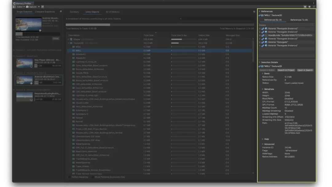 Unity 对象(Unity Objects)视图应该是最常用的视图。它列出了所有加载到内存的对象,如纹理、着色器、字体等。用户通常可以在此处找出哪些对象过大,哪些是错误加载的,或者哪些一直被引用、保留在内存里的。