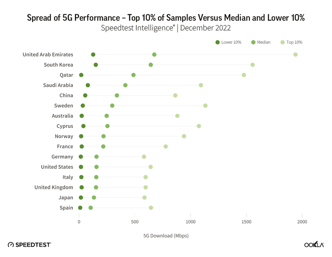 Ookla 于 2 月 16 日发布了新的一期全球 5G 性能新报告,并收集了一部分用户对于 5G 网络的看法。Ookla 首先展示了 16 个国家的 5G 速度,并表示:「虽然 5G 的峰值速度令人印象深刻,但数据同样显示 5G 性能的起伏程度比较大,即使在早些时间就已经推出或是采用先进技术的 5G 国家也是如此。」