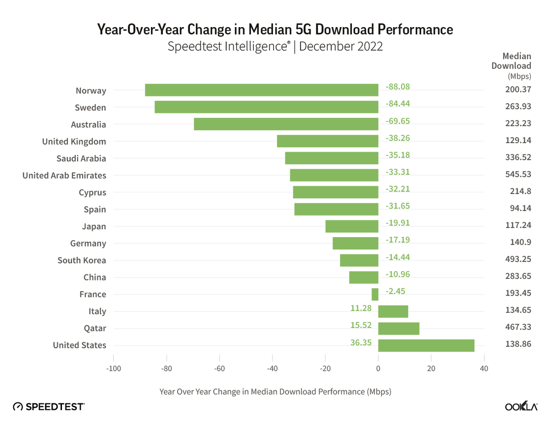Ookla 接着展示了各个国家 5G 下载速度的中位数 22 年和 23 年的对比,并表示:「美国、意大利和卡塔尔在过去一年中、为数不多的 5G 下载速度有所提高的国家。」