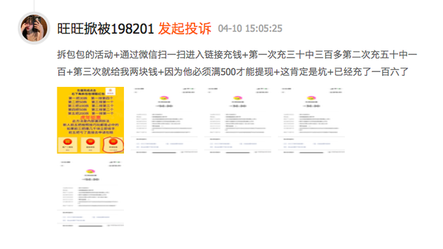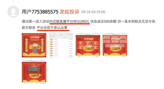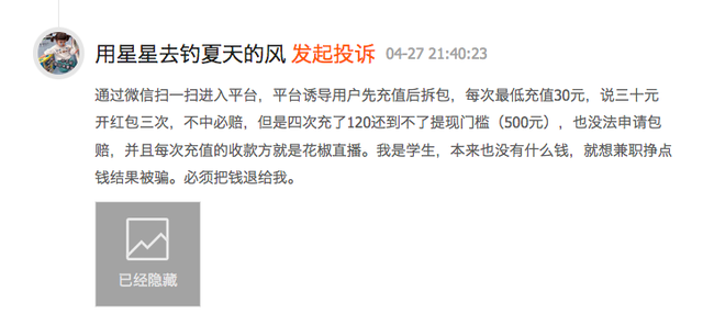 目前除了曝出的“砸金蛋、礼物猜猜猜”这些玩法外,近期在黑猫投诉平台上,也有多位网友投诉花椒直播,原因是这几位网友玩了一个叫“拆包”的抽奖游戏,从投诉者的描述来看,这是一个用户充值后可以参与拆包,有一定中奖几率的玩法,但显然,发起投诉的人都认为自己是被“套路”了。