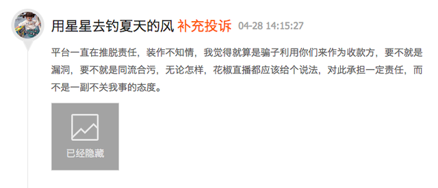 但也有2位投诉者称“平台方拒不承认此事”、“平台一直在推脱责任,装作不知情”,这也说明这个“拆包”的活动很可能并非花椒直播官方推出,但蹊跷的是,这两位投诉者,一位晒出的支付信息截图显示,收款方是花椒直播,另外一位投诉者也有提及“每次充值的收款方就是花椒直播”。