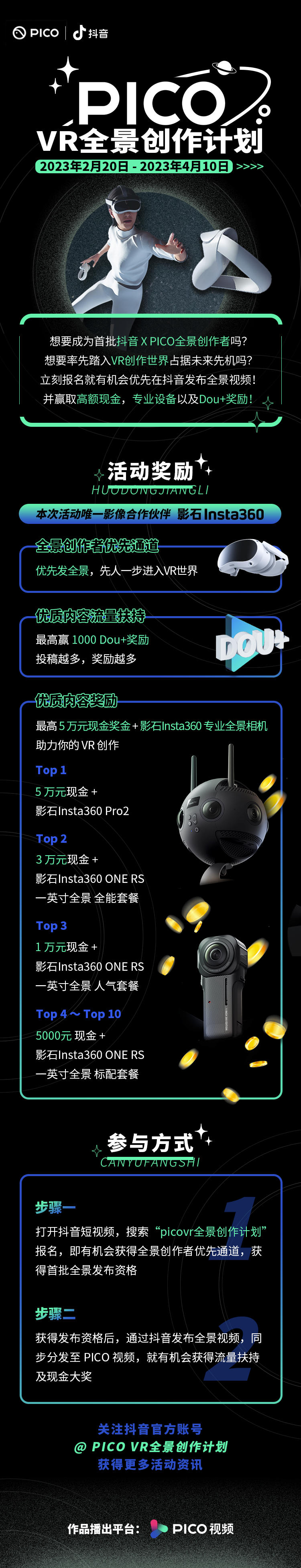 那看这里,PICO VR全景视频创作计划正式启动,首批抖音 X PICO 全景创作者火热招募中啦!多重创作福利已经码好,欢迎你的加入!
