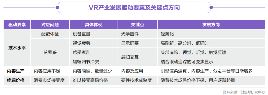 近年来,随着技术进步,光学器件逐渐走向超薄化,显示屏幕高分辨率、高刷新率和低延时成为当前主流配置方案;感知交互方面,头部追踪技术基本成熟,结合眼动追踪的可变焦显示大幅缓解了VR的眩晕感,硬件层面问题逐渐得到改善。