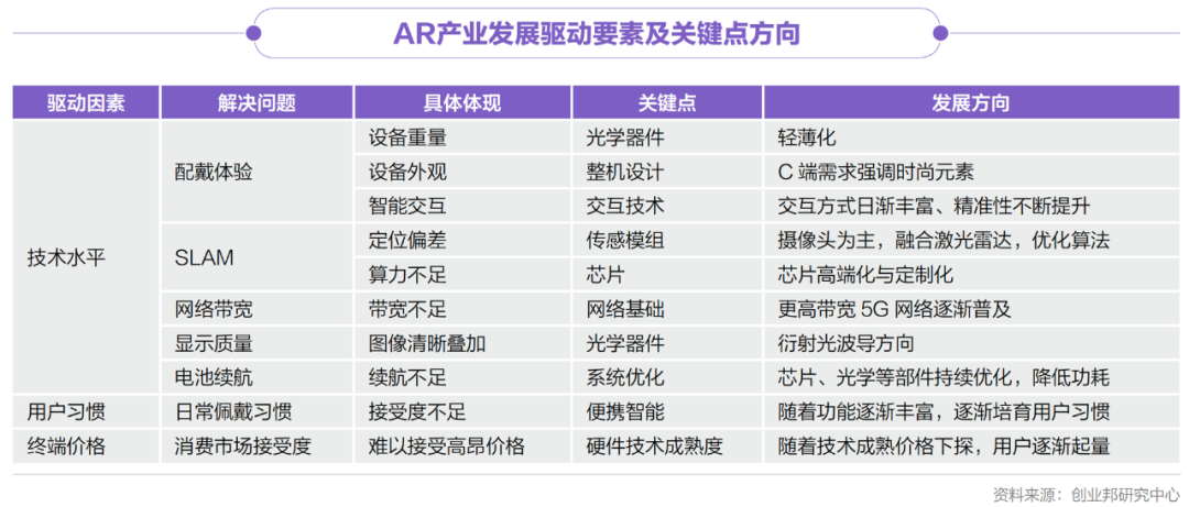 由于AR技术难度和对硬件的要求都要高于VR,AR光学显示的清晰度与稳定性,定位与地图构建Slam及其对于算力、带宽、延时的要求,电池续航等问题都尚待解决,成为AR行业发展的决定性因素。