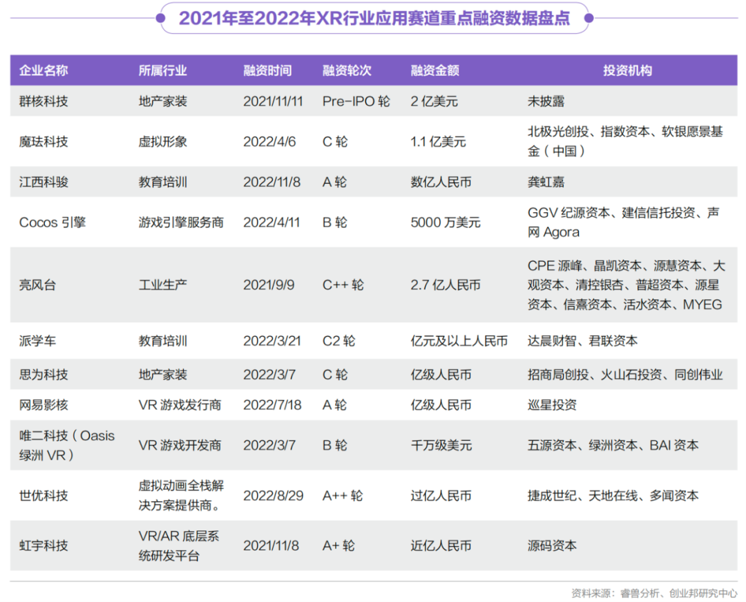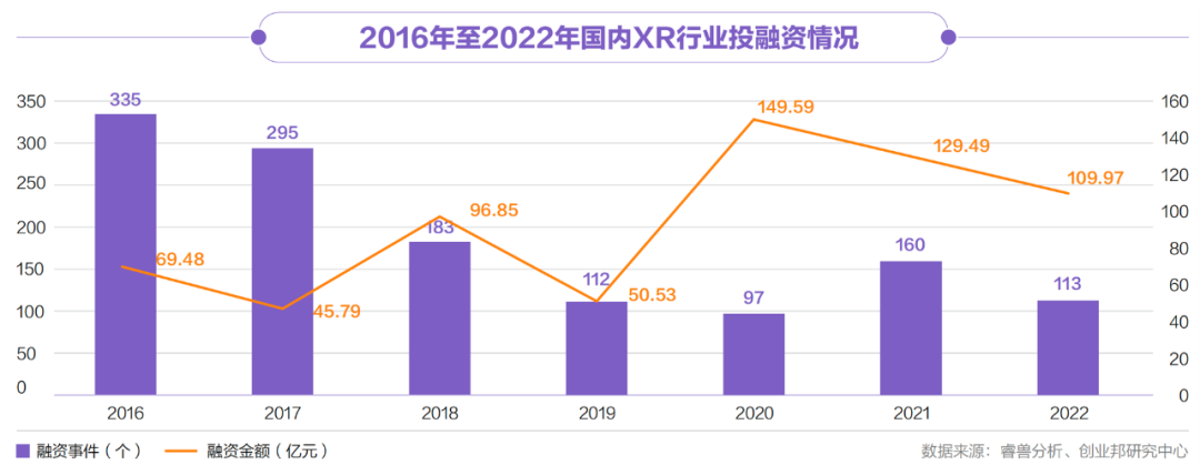 随着VR终端市场放量、AR眼镜逐渐进入消费级市场,叠加初创企业在各类垂类领域中的创新应用逐步落地,2021年市场开始回暖。2021年投资事件达160件,融资金额为129.49亿元,2022年事件为113件,金额达109.97亿元。