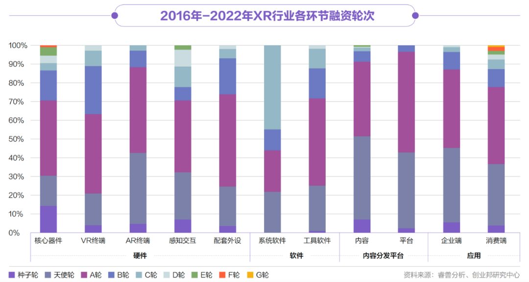 从2016-2022年融资轮次来看,融资事件以A轮及A轮以前的早期融资为主,其中AR终端、内容、分发平台和应用等环节的早期事件占到80%左右,仅系统软件环节C轮融资接近50%。
