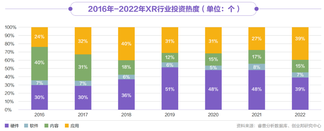 从投资热度来看,2016年至2022年硬件和应用赛道融资事件占比逐渐攀升,2021年两者共占75%,软件和内容融资事件比重逐渐减少,2021年共占25%,2022年进一步减少为22%。