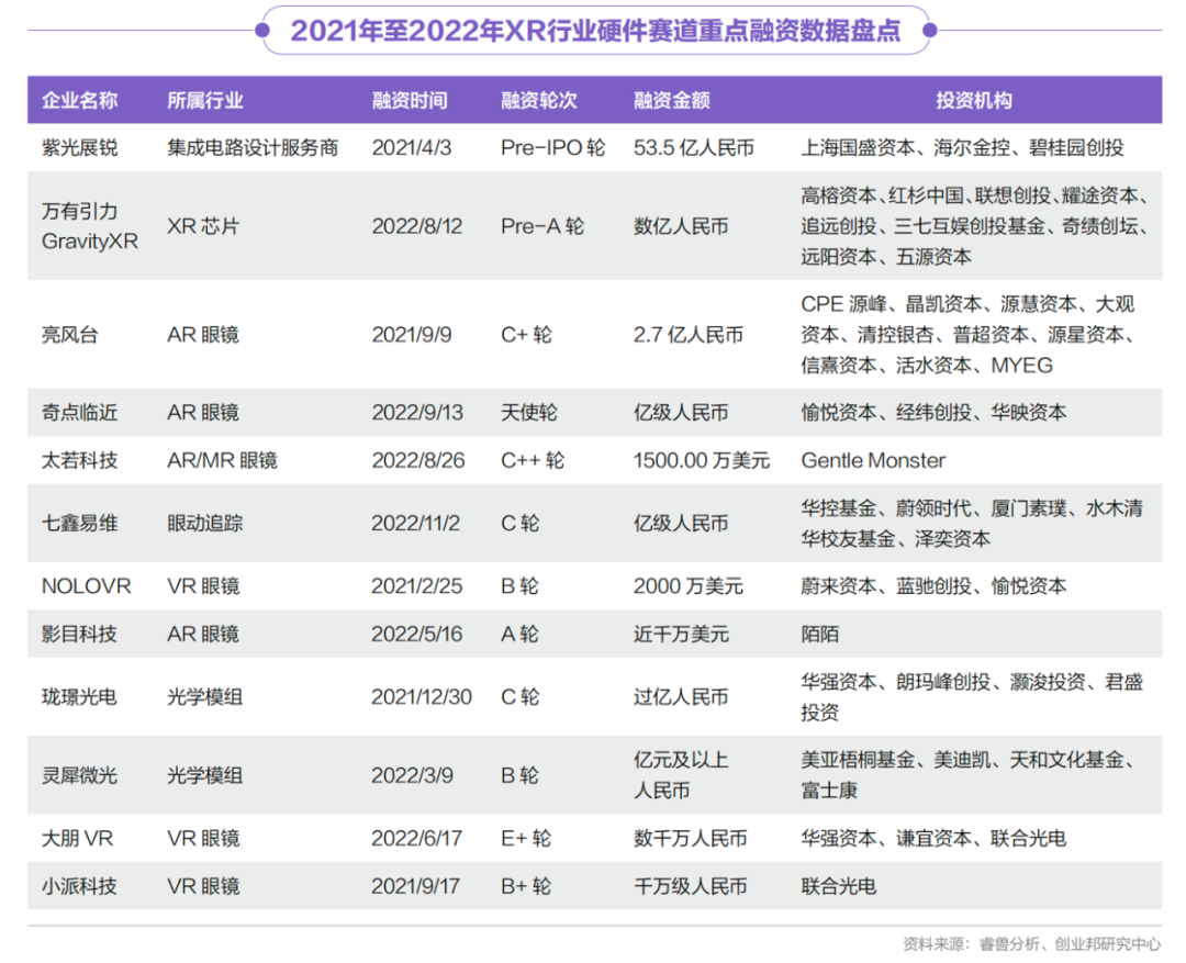 2022年获得融资较多的赛道有AR终端、芯片、感知交互、显示、光学和配套外设。从2021年至2022年融资情况来看,芯片赛道的万有引力GravityXR,光学模组赛道的珑璟光电、灵犀微光,XR终端赛道的太若科技、亮风台、影目科技、NOLOVR、奇点临近、小派科技、大朋VR等有着不错的融资表现。