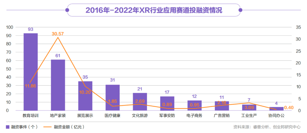 从融资金额来看,集中在地产家装、教育培训和展览展示三大场景,分别为30.57亿元、11.86亿元和10.2亿元。