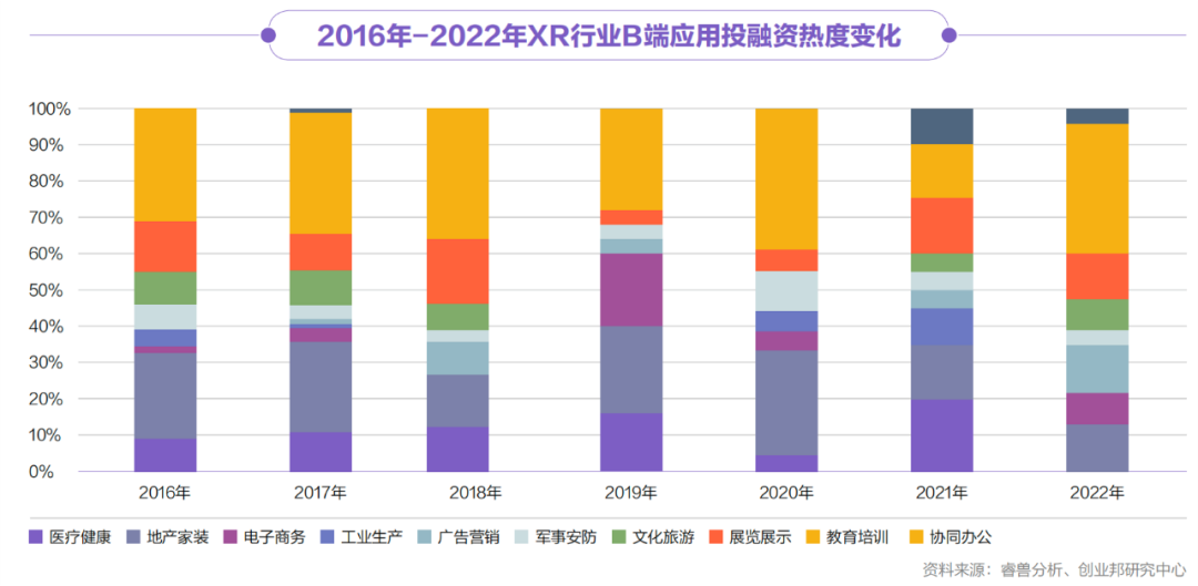 2016年至2022年B端应用中教育培训和地产家装赛道热度较高,融资事件分别为93件和61件;其次为展览展示、医疗健康,融资事件分别为35件和31件;文化旅游、军事安防、电子商务等领域融资事件均在20件左右及以下。