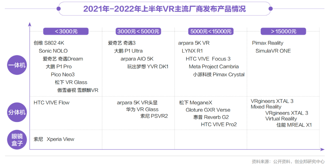 VR新品密集发布,销量TOP产品价格下探至3000元以内。2021年至2022年上半年主流厂商发布的23款一体机中销量较高的产品,如Pico Neo 3、Sonic NOLO、爱奇艺奇遇Dream和大鹏P1 Pro在配置采用当前主流技术配件的前提下,价格均在3000元以内。价格在5000元以上的产品在刷新率、高清度上有不同程度的提高。