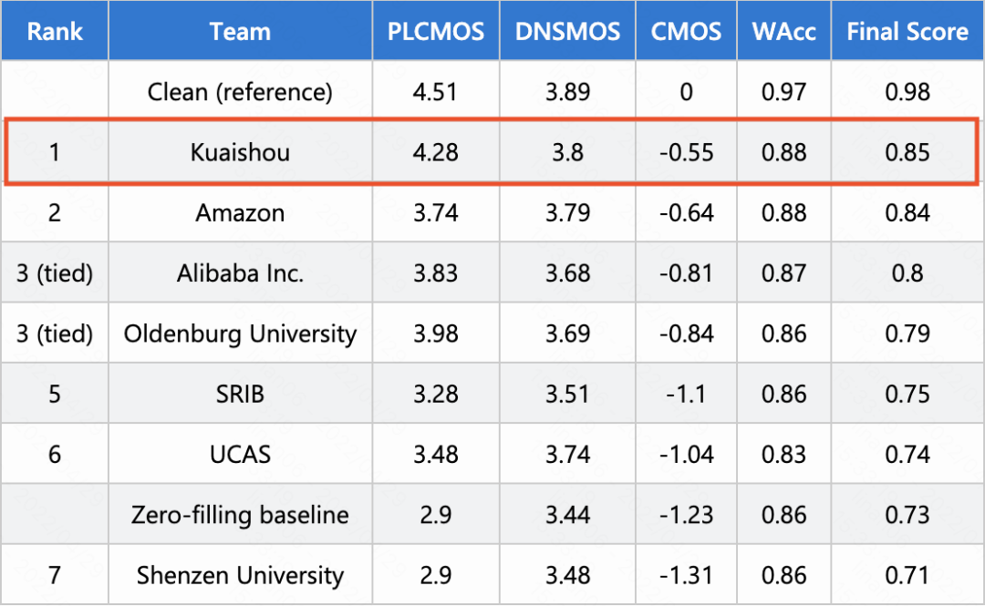 近日,在由全球语音技术顶尖会议INTERSPEECH 2022与微软联合举办的音频丢包隐藏挑战赛中,快手音视频技术团队在主办方评估的丢包隐藏平均主观意见分(PLCMOS),深度降噪平均主观意见分(DNSMOS),众包平均主观意见分(CMOS)和语音识别字准确率(WAcc)四项指标中均排名第一,综合得分获得世界冠军。
