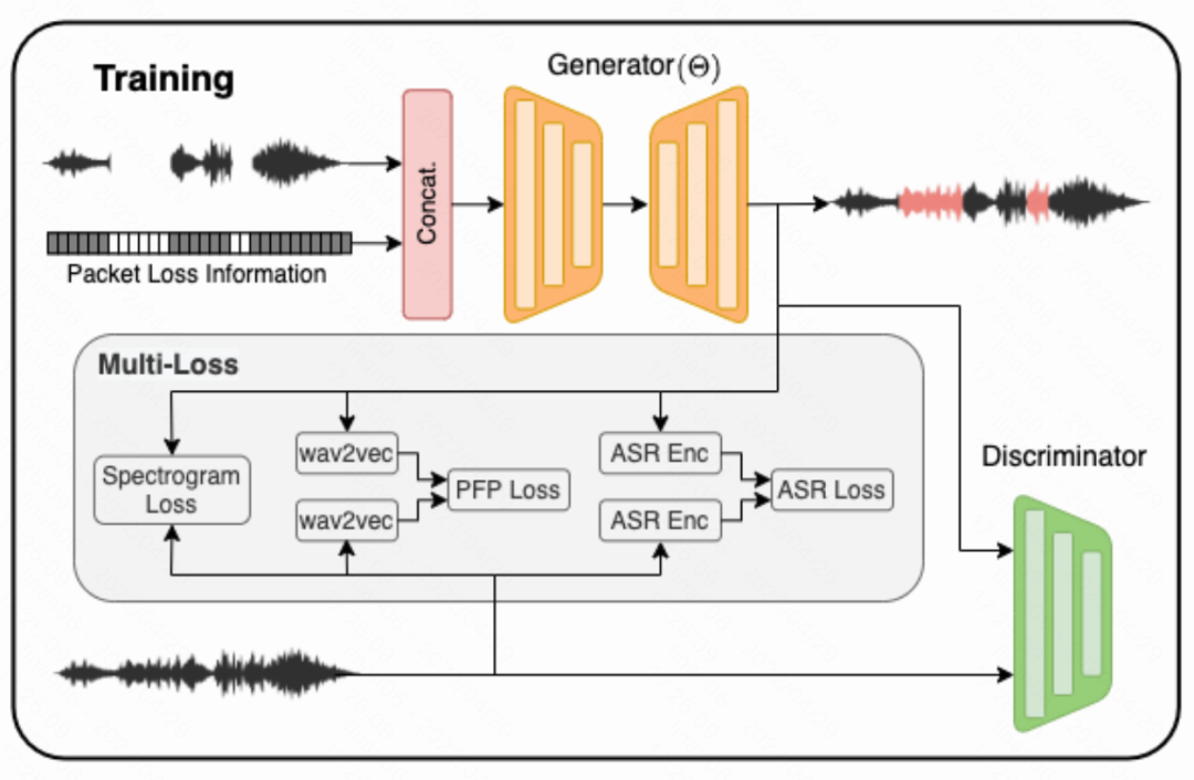 该系统基本架构为生成对抗网络(Generative Adversarial Network, GAN),由生成器(Generator模块)和判别器(Discriminator模块)组成,并创新性地提出了综合考虑主观听感、客观指标等多样化评估标准的组合损失函数(Multi-Loss模块),基于上千小时的多样化数据进行训练,使得系统能够将输入的丢包音频和丢包信息进行处理,最终输出高音质音频信号。