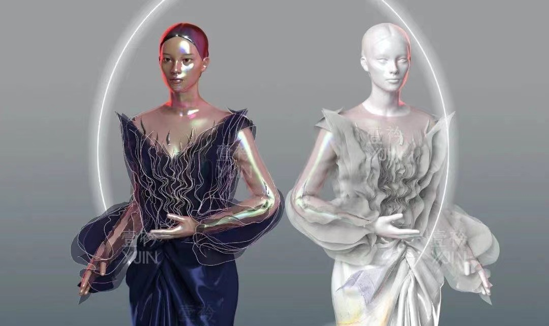 元宇宙秀场展示的12套为1:1真实还原。用科技打造服装设计的另一种美,元宇宙世界与线下秀场镜头切换演绎,多样的美学表达。