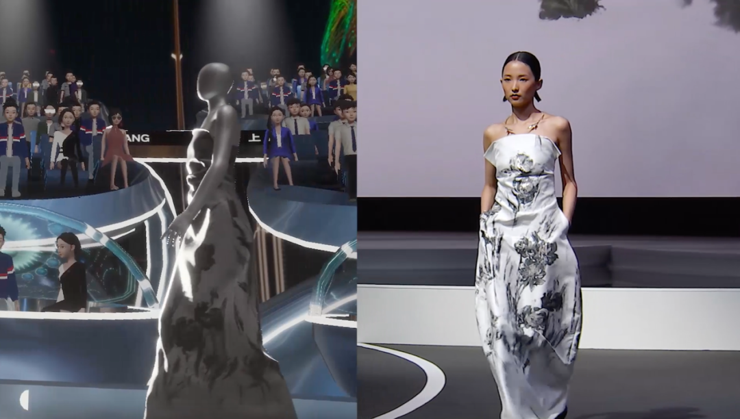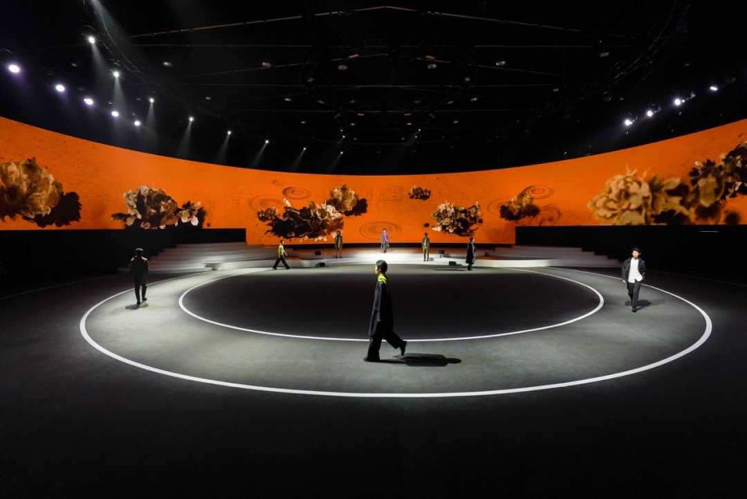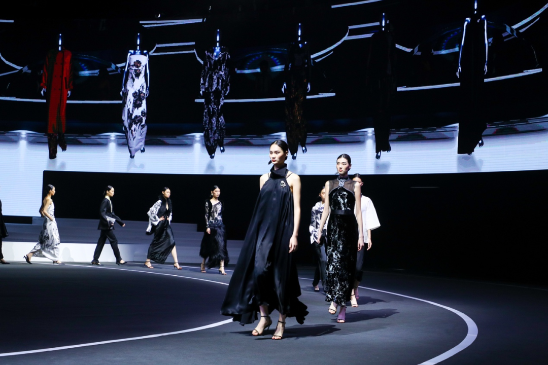 主会场的真人模特顺时针方向绕场行走,代表时间的流逝;元宇宙分会场的数字模特以逆时针方向走秀,打破时间的规则。