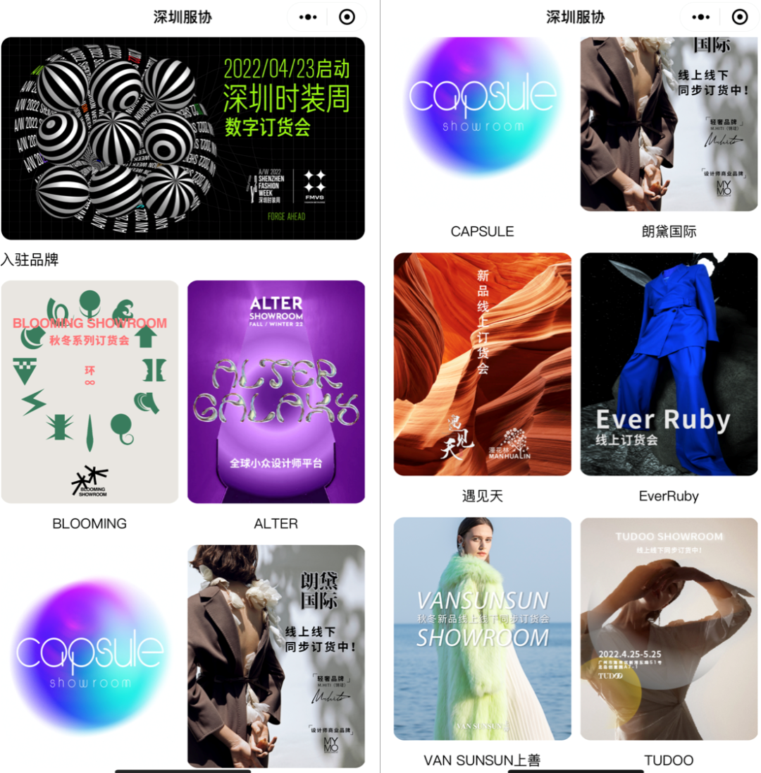 数字订货平台的诞生,让设计师能够获得公域流量并从中筛选品牌客户,引流至品牌运营的店铺去看货,通过深圳时装周官方微信公众号的“订货会”选项,便可以进入数字订货平台,点击进入品牌介绍后底部有“进入订货”选项,除部分showroom是外链至其自身的小程序外,剩余入驻品牌均为跳转至“快订通”小程序并通过线上完成订货。
