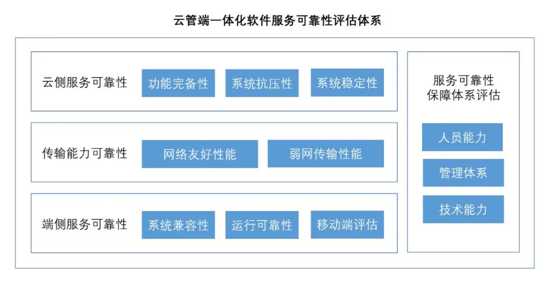 针对以上问题,中国信通院“铸基计划”推出了面向云管端的一体化软件服务可靠性评估体系。该体系由云侧服务、传输能力、端侧服务以及可靠性保障体系评估四部分组成。构建了面向云管端一体化软件系统架构和可靠性能力保障体系,以“服务能力+管理体系”为核心链条的全方位可靠性评估体系。