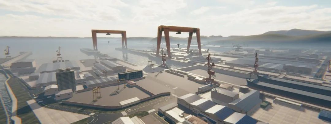 Unity 已经与大宇造船及海洋工程公司签署智能船厂合作备忘录,将共同建造一座基于数字孪生的智能造船厂。双方将共同推动智能船厂建造和运营仿真平台的开发,并引入包含机器学习技术在内的船厂数字孪生运维系统。通过对真实船厂数据的可视化完成船厂设施和空间布局的虚拟仿真,真实还原了韩国大宇船厂的虚拟三维模型。