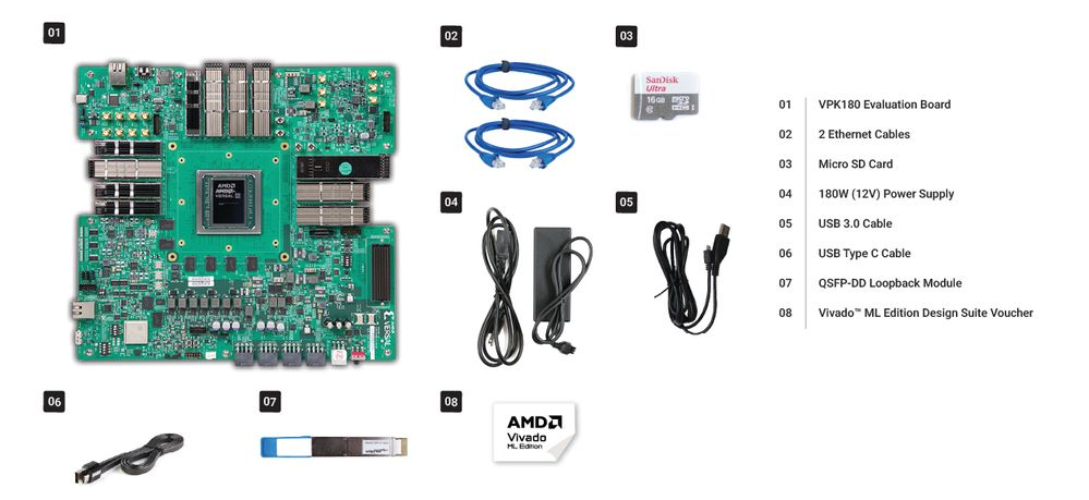随电路板一起提供的配件和工具包括为期一年的 Vivado™ 机器学习版(Vivado ML Edition )设计套件许可证、电源、USB 和以太网线缆、microSD 卡以及 QSFP-DD 回环模块。