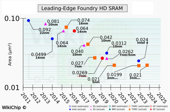 最近几周,我们第一次看到这种平坦曲线是在2022年12月国际电子器件会议上WikiChip Fuse的一份报告中,该报告概述了缩小SRAM单元面积的困难: