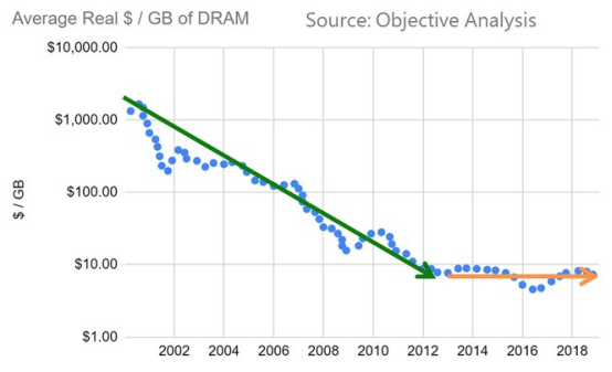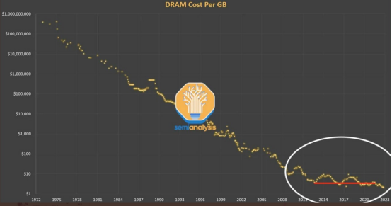 这个图表来自Dan Ernst,他是Cray的前高级技术架构师,现在是微软Azure未来架构团队的一员,他把这个图表放在他的Twitter上,作为对SemiAnalysis的Dylan Patel的一篇文章的回应。这是Ernst发布的关于DRAM定价的图表: