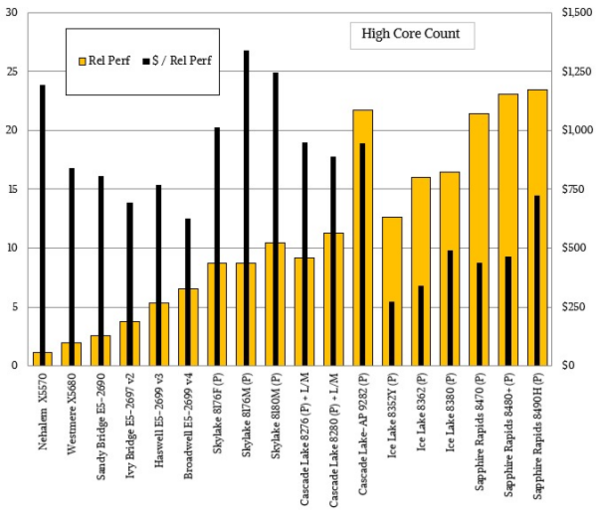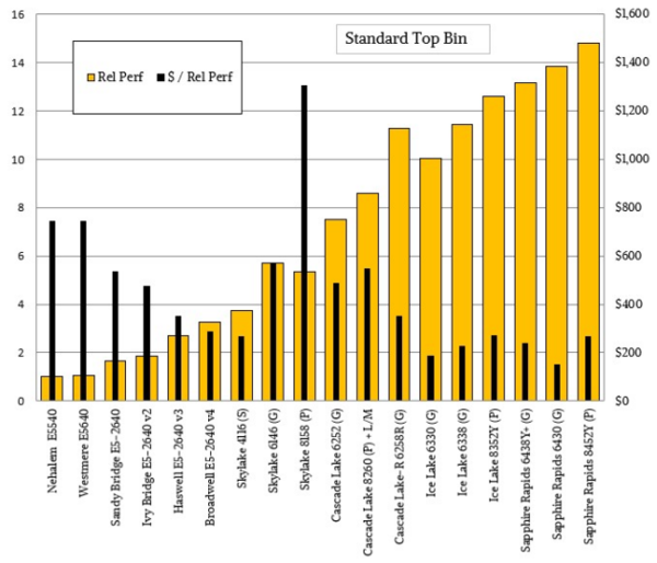 这两个图表是我们对英特尔至强和至强SP服务器CPU系列的性能和性价比进行分析后的一天出现的,在这些产品中,标准的主流部件遵循了单位工作成本持平的定价曲线: