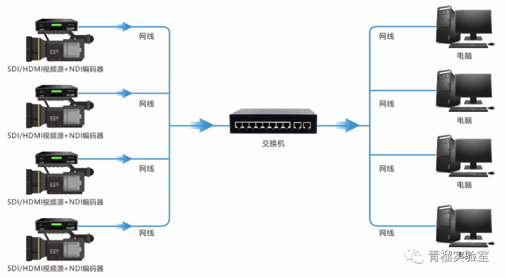 使用NDI技术,就可以通过网线代替传统的SDI或HDMI线缆传输。这种IP化传输技术简化了制播系统的构建以及系统内各种信号的传输、调用、复用,使得系统设计、集成、应用、维护、功能拓展等更加简单和灵活,同时节省了SDI或HDMI线缆成本。