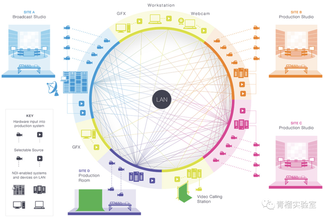 NDI是 Network Device Interface 的简称,即网络设备接口,是由美国NewTek 公司(已被 Vizrt 收购)于2015年推出的免版税的高质量、低延迟、多通道的音视频传输技术。可以免版税使用,但是并不开源。音视频信号在进行NDI编码压缩后,能实时地通过IP网络进行传输和接收,具备超低延时(帧级)和质量几乎无损的优势特点。