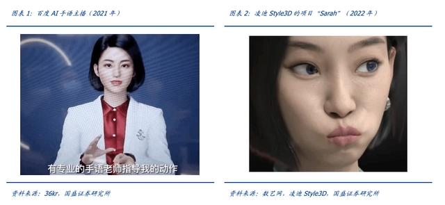 以专业团队创作的服务型数字人为例,2021年的百度AI手语主播和2022年凌迪Style3D的项目“Sarah”相比,拥有超精细皮肤渲染的Sarah在观感和表情细节(甚至包括皱纹)更加接近真人。