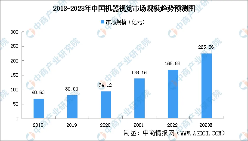 机器视觉需求带动下,中国机器视觉市场规模持续增长。2021年中国机器视觉市场规模138.16亿元,同比增长46.79%。随着机器视觉硬件方案的不断成熟和运算能力的提升,以及软件在各种应用解决方案、3D算法、深度学习能力的不断完善,机器视觉在电子产业(如PCB、FPC、面板、半导体等领域)应用的广度和深度都在提高,并加快向新能源锂电、光伏等其他领域渗透,在AI、自动驾驶、人脸识别等新兴技术兴起的带动下,我国机器视觉市场规模将继续保持较高的增速。预计2023年中国机器视觉市场规模将达225.56亿元。