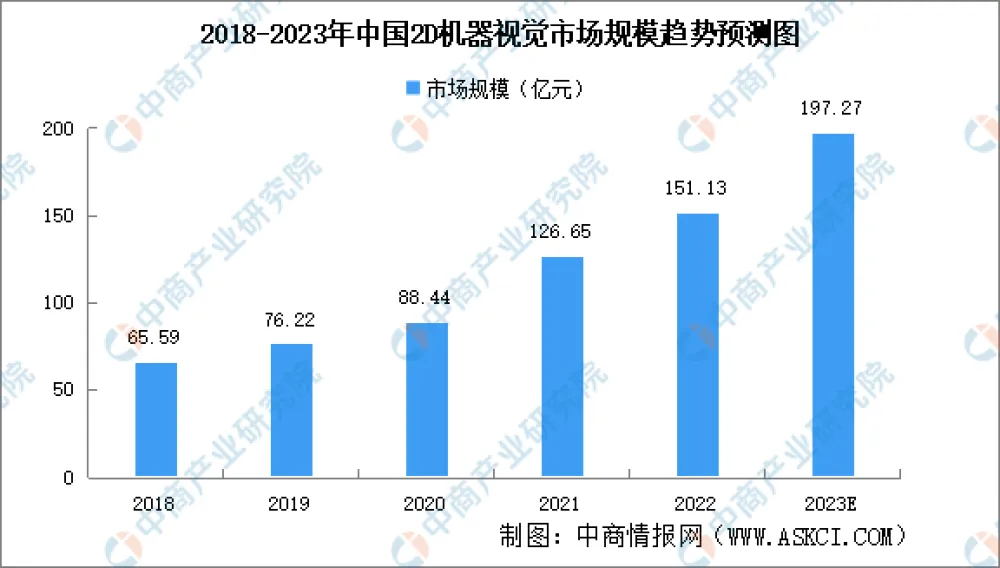 2D目标检测算法不断成熟,无论是精度还是检测速度都已达到较高的水准,在制造业领域已经取得广泛的应用。当前,中国机器视觉市场以2D机器视觉为主,2021年2D机器视觉市场规模126.65亿元,预计2023年2D机器视觉市场规模将达197.27亿元。
