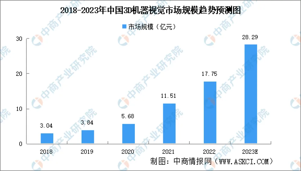 3D机器视觉可以测量包括高度、角度、平面度、厚度、体积、颜色相近表面等信息,通过更丰富的数据采集获取物体的三维图像。3D机器视觉还具备高测量稳定性、高精度及可重复性等优势。近年来,随着工业化及智能制造的大力发展对精确度的要求越来越高,3D机器视觉检测应用范围愈发广阔。2021年中国3D机器视觉市场规模11.51亿元,预计2023年3D机器视觉市场规模将达28.29亿元。