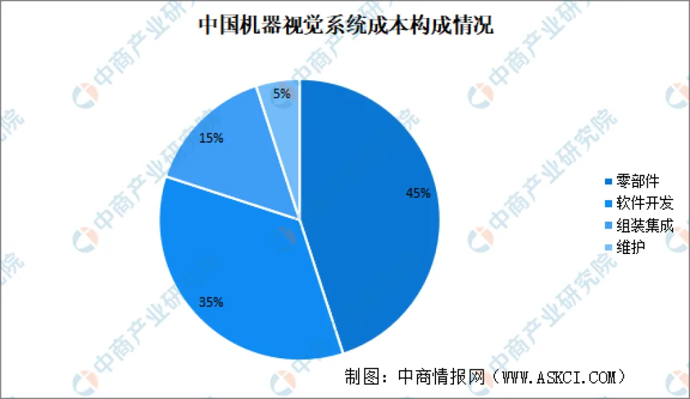 从机器视觉系统机器成本构成上看,在机器视觉系统中,中游零部件环节的占比最大,高达45%,软件开发环节(包括上游视觉控制系统和下游设备商的二次开发)的占比为35%,零部件和软件开发环节合计占比高达80%,是机器视觉的核心环节。此外,机器视觉系统的组装集成和维护占比为20%。