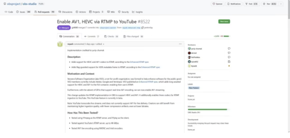 关于OSB新版本的开发进度,基于GitHub上的更新日志,目前该功能以及通过了英伟达的NVENC和英特尔编码器测试,最高可达4K60帧,但还没写到关于AMD的内容。目前OBS Studio 29.1的开发里程碑已经完成90%以上了,相信新版本很快会和用户见面。