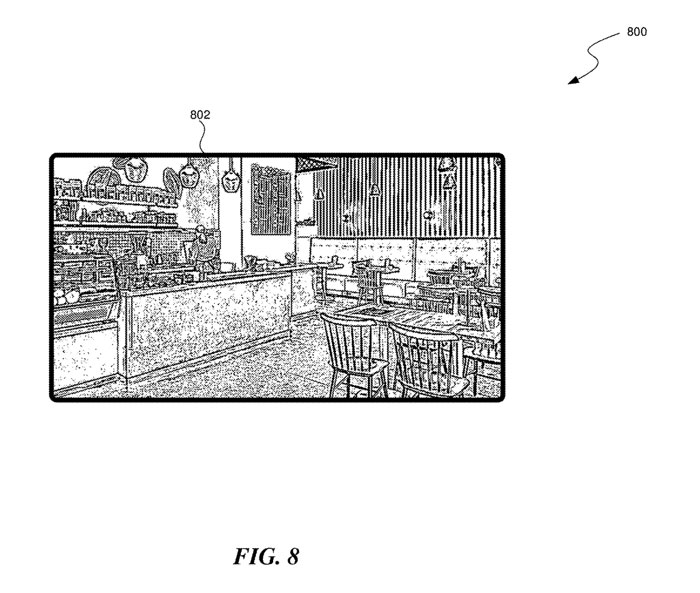 图8是输出视图的视点版本。在示例800中,视点版本仅包括世界视图版本的一部分,亦即图像802。所述图像802基于用户视点,并对用户是可见。随着人造现实设备用户移动,可以更新图像802以说明用户的当前可视区域。