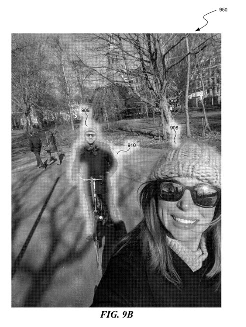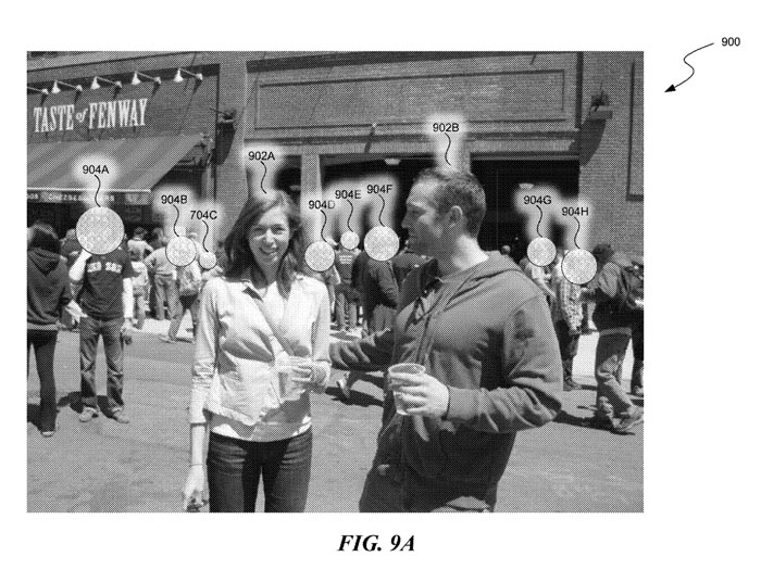 图9A是示出应用滤镜器的第一示例900的。在示例900中,人造现实设备已经确定人造现实设备的用户的当前焦点在人702A和702B。人造现实设备同时识别出了视场中的其他多个人。基于非焦点人物的面部应该应用模糊效果的规则,人造现实设备将模糊效果704A-H应用于非焦点人物。