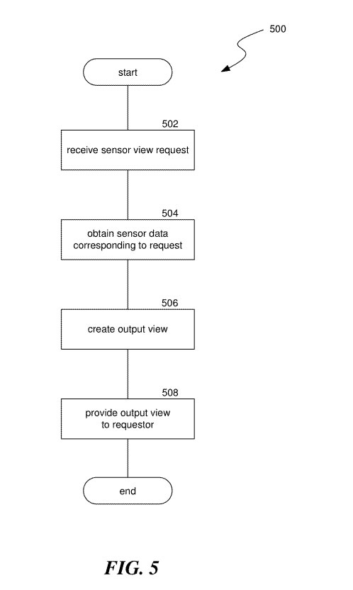 在方框502,接收传感器视图请求。当请求来自第三方系统时,过程500可以包括各种隐私和认证步骤,例如获得请求者证书以证明其身份,请求人造现实设备用户对所述请求进行批准,检查允许的观看者列表等。当请求来自当前人造实现设备用户本身时,它可以包括选择将结果输出视图发送给哪些用户,和/或结果输出视图是公开可见的还是对特定用户见。