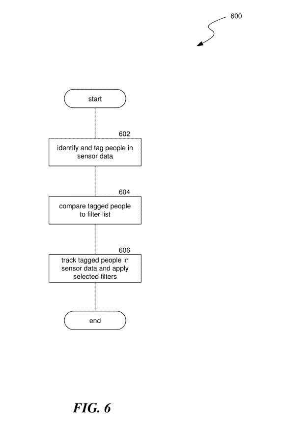 在方框602,过程600可以识别并标记传感器数据中描绘的人。在框602,可以例如分析图像数据和设备通信数据,以应用各种识别技术来识别人,例如面部识别和体型识别等。传感器数据的部分可以用相应的用户标识符进行标记。另外,用户的图像可以被分割,使得所识别的用户的部分可以被单独地掩码,以便将滤镜器应用于用户的部分。