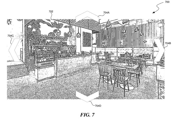 图7示出了输出视图的世界视图版本。在示例700中,世界视图示出了基于人造现实设备捕获的深度图像的周遭环境的全景图像702。全景图像702是通过从热俺早现实设备的角度令3D模型变平而创建,其中3D模型基于点云,每个像素具有相关联的深度。