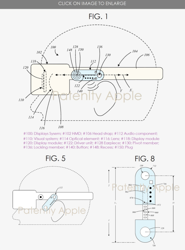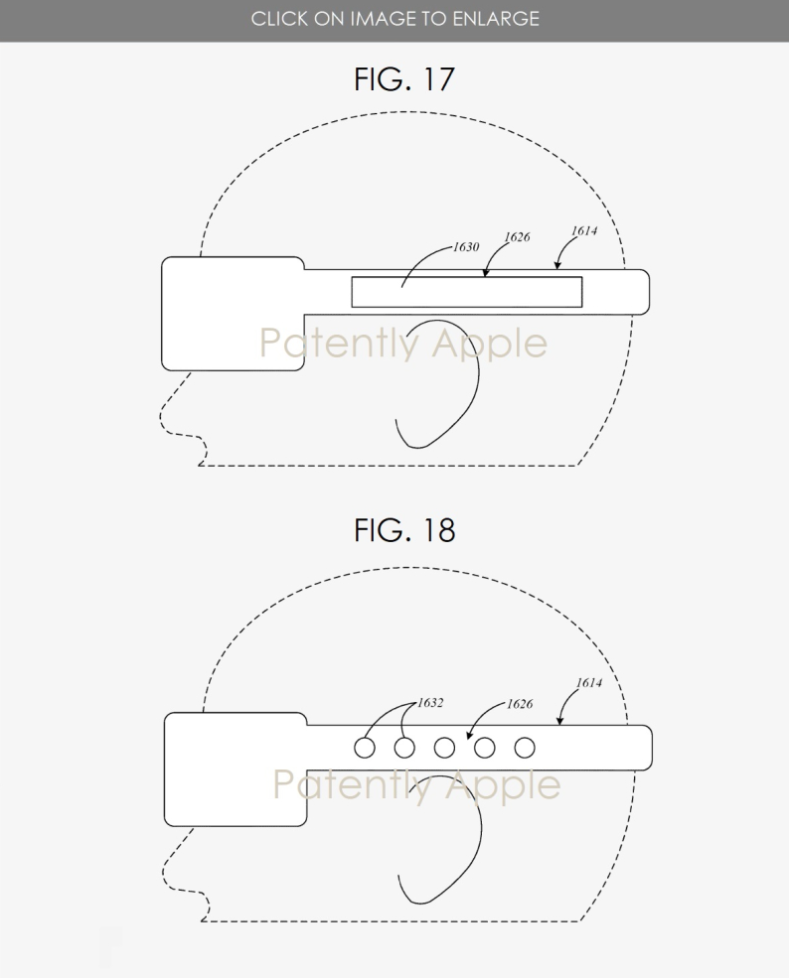 苹果的专利图5是可穿戴显示系统的侧面平面图,表示音频组件在混合模式下的操作,该模式允许声音的听觉内和听觉外投影;图8是音频组件的侧面、平面图,表示第二(细长)配置。 苹果专利图17和图18是侧面、平面图的替代实施例的可穿戴支持与音频组件一起使用。