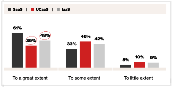 这是说他们的 UCaaS 投资完全实现其预期效益的IT决策者的百分比,如节约成本和易于管理。这个数字来自于 Tangoe 和科技媒体合作伙伴 Foundry 的调查。2023年1月,他们调查了200名大型企业的IT决策者(ITDMs)(平均员工人数为6855人)。