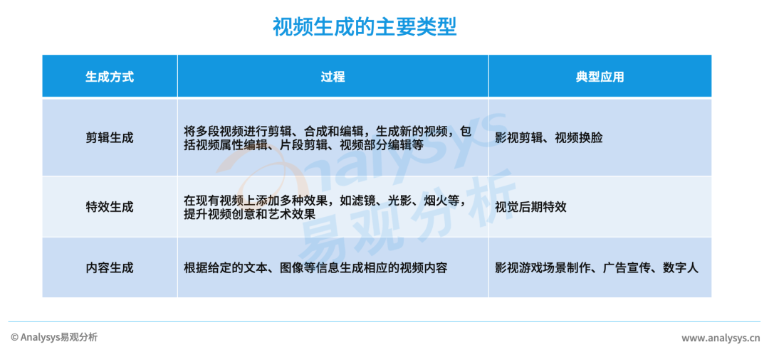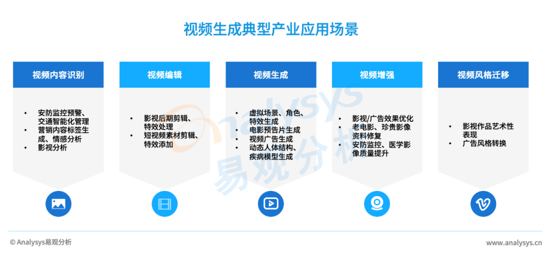 基于应用视角可以对视频生成的方式做进一步细分,包括剪辑生成、特效生成和内容生成,三种方式的结合使用可以大量应用在电影电视、游戏、短视频、广告等视觉制作领域,在工业设计、建筑设计、教育培训等行业也可以提供更加直观的演示效果。