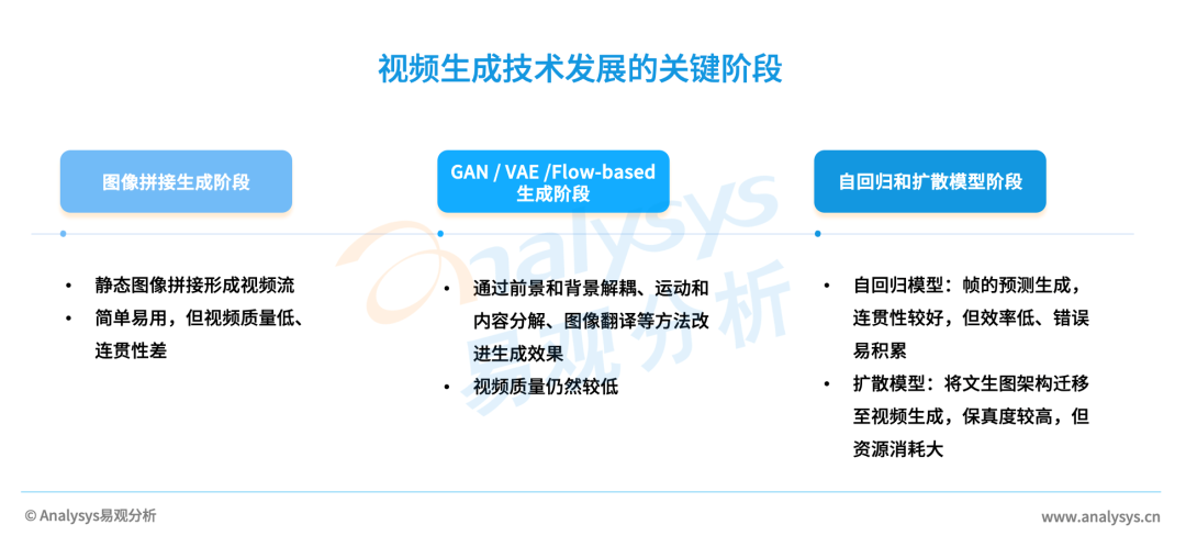 视频生成的技术发展可以大致分为图像拼接生成、GAN/VAE/Flow-based生成、自回归和扩散模型生成几个关键阶段,随着深度学习的发展,视频生成无论在画质、长度、连贯性等方面都有了很大提升。但由于视频数据的复杂性高,相较于语言生成和图像生成,视频生成技术当前仍处于探索期,各类算法和模型都存在一定的局限性。