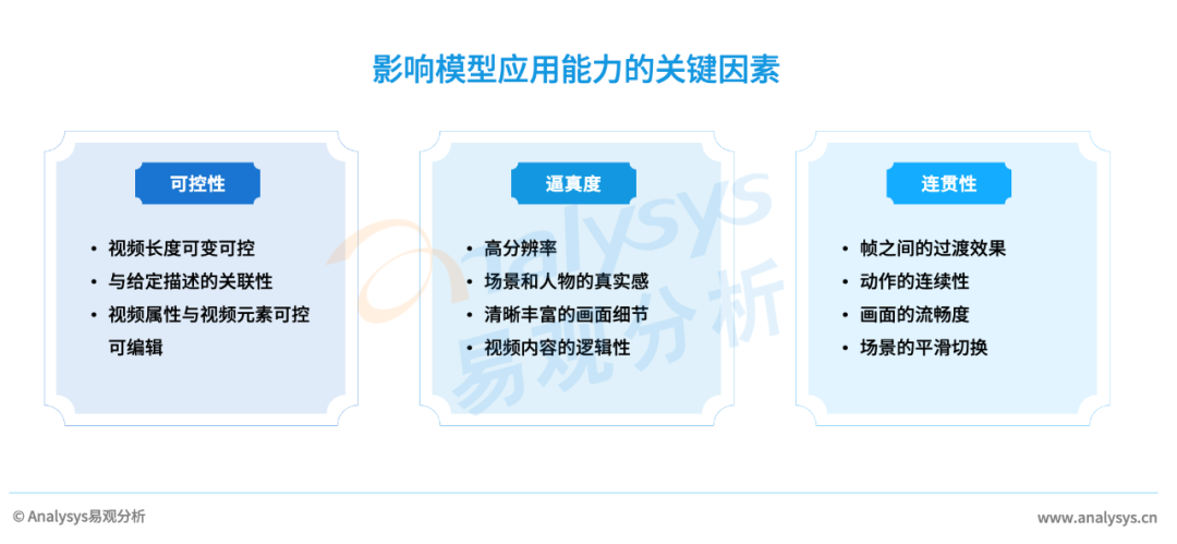 对视频的可控性要求主要包括是否能够生成任意长度的视频、能否根据用户需求进行时长调整、与给定的文本和图像的关联性是否足够强、视频属性和视频中的元素是否可控可编辑,这需要提升模型对长文本理解能力,并且在时长增加的同时需要保证生成速度和画面质量的稳定。特别是对影视、动画、广告等视觉制作领域的行业用户而言,可变可控是视频生成深入行业应用的基础。